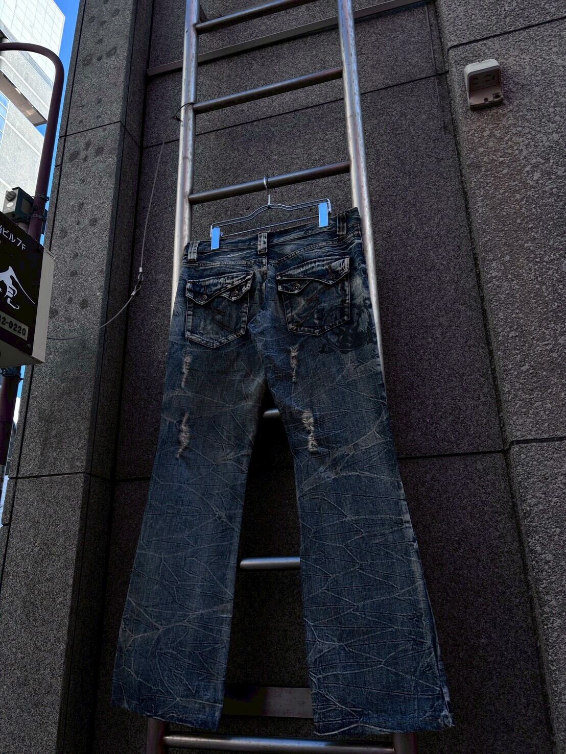 00s SemanticDesign y2k destroy lowrise flare denim/00年代 セマンティックデザイン ダメージ加工 総柄 クラッシュ ローライズ フレアデニム ジーンズ