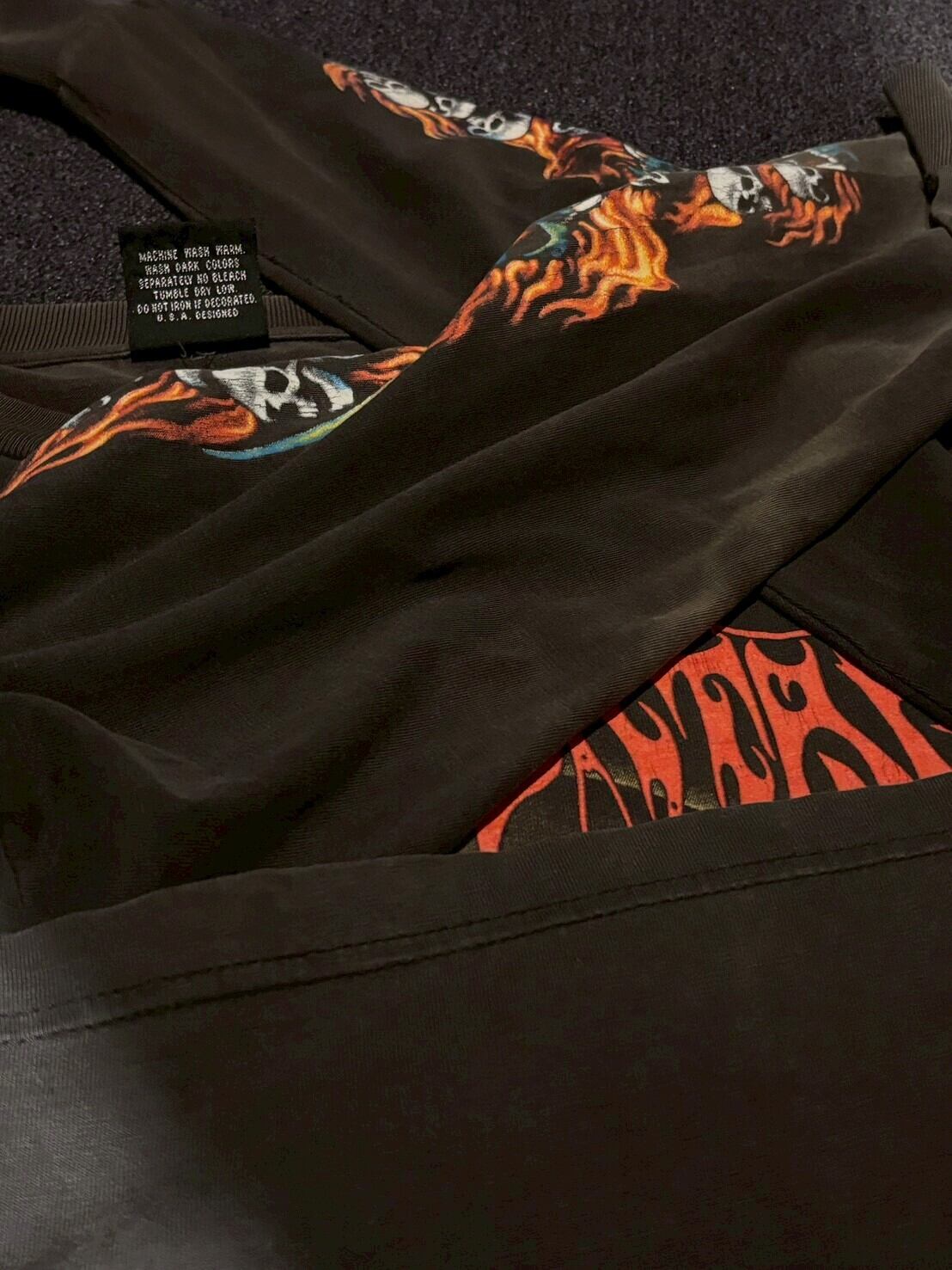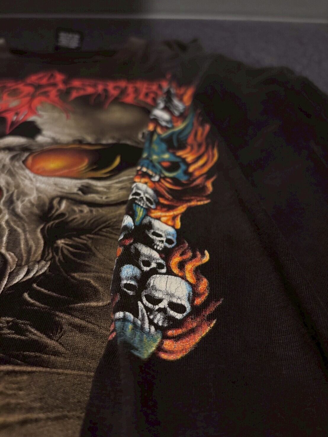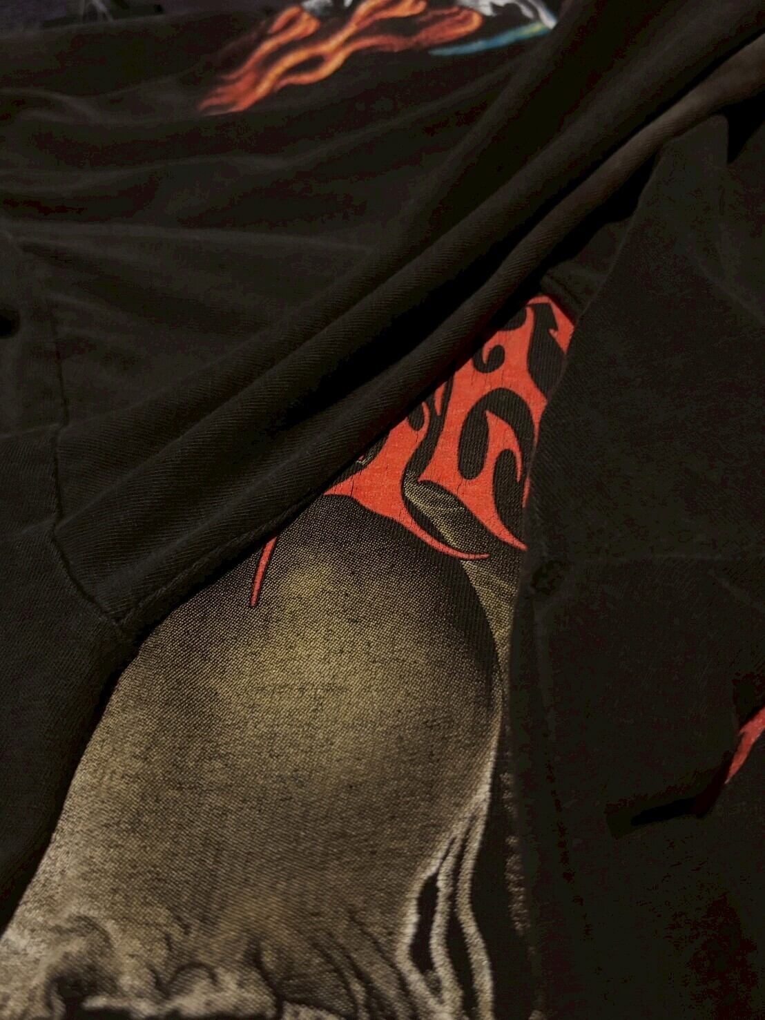 フロントにはインパクト抜群のスカルグラフィック、両袖にも炎×スカルのプリントが入るフルデザイン仕様。フェードしたブラックボディとプリントのクラック感が相まって、90s特有の退廃的な空気感をしっかり纏っています。