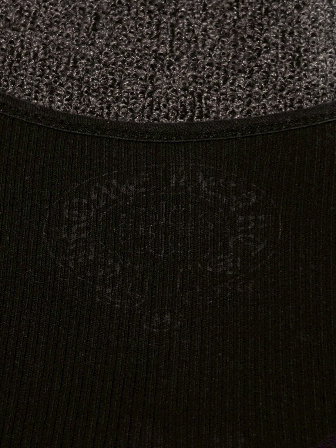 程よくフィットするリブ素材で、インナーとしてはもちろん一枚でもスタイルが決まるシルエット。ブラックボディにホワイトプリントのコントラストが効いており、無骨さとフェミニンさが絶妙に共存しています。