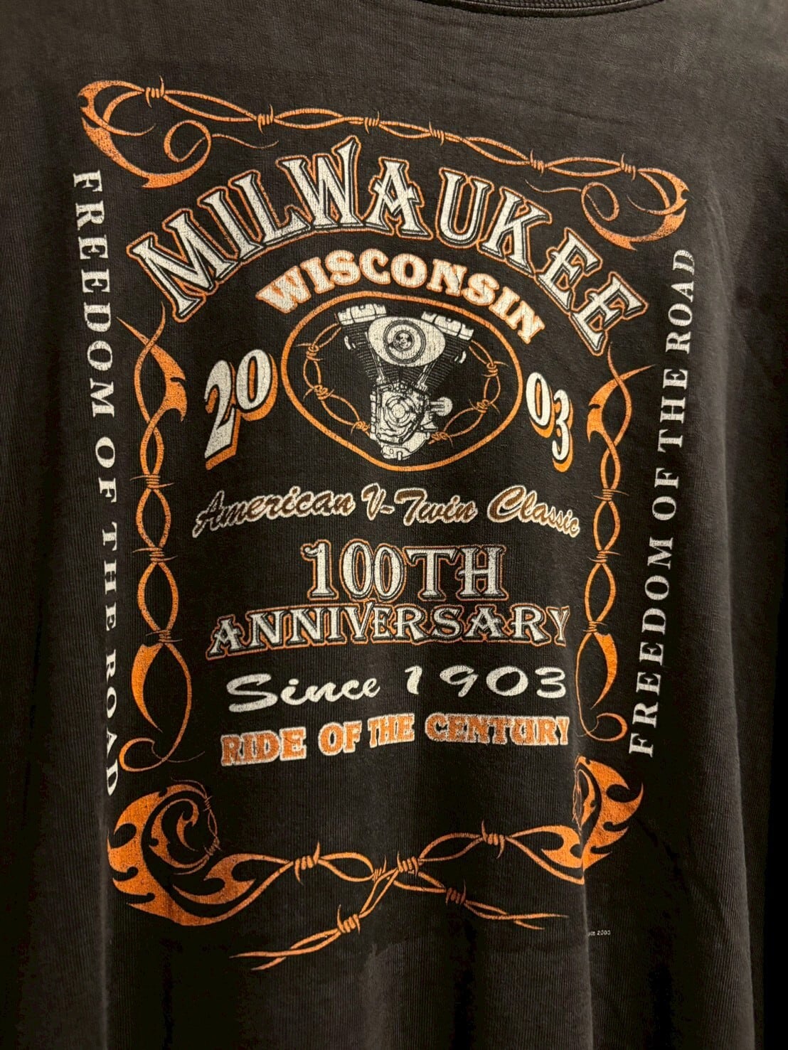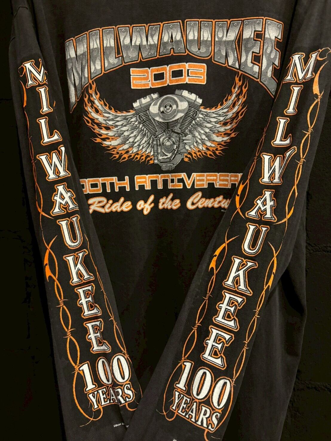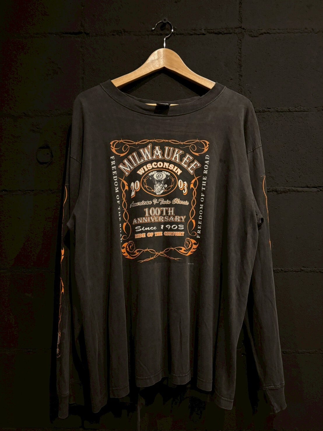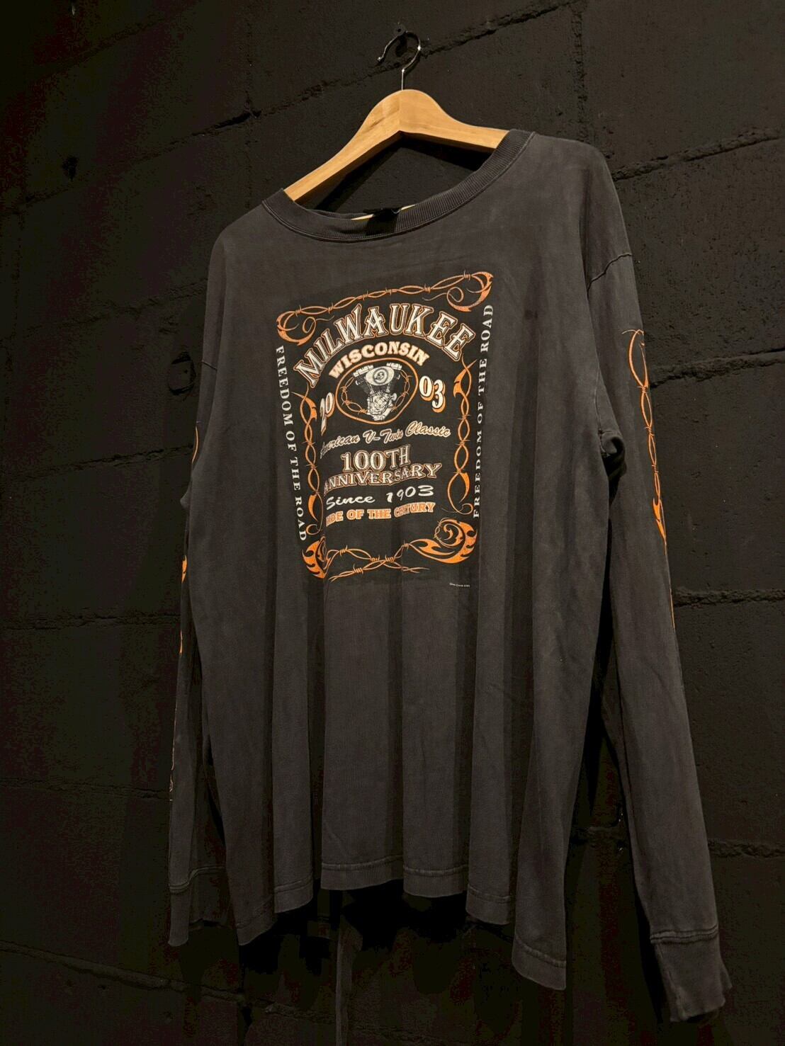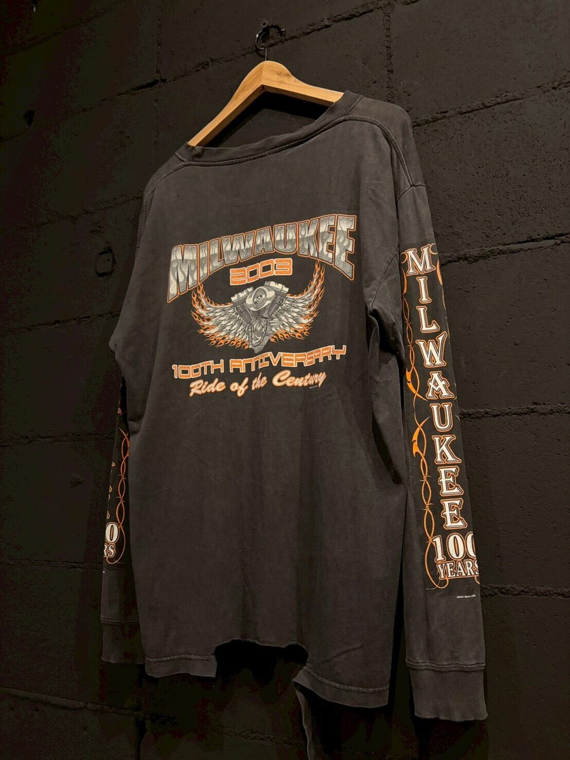 00s MILWAUKEE 100th anniversary flame sleeve black faded long sleeve Tshirt/00年代 ミルウォーキー 100周年 フレイムスリーブ 袖フレイム黒フェード ロングスリーブtシャツ ロンT アメカジ バイカー