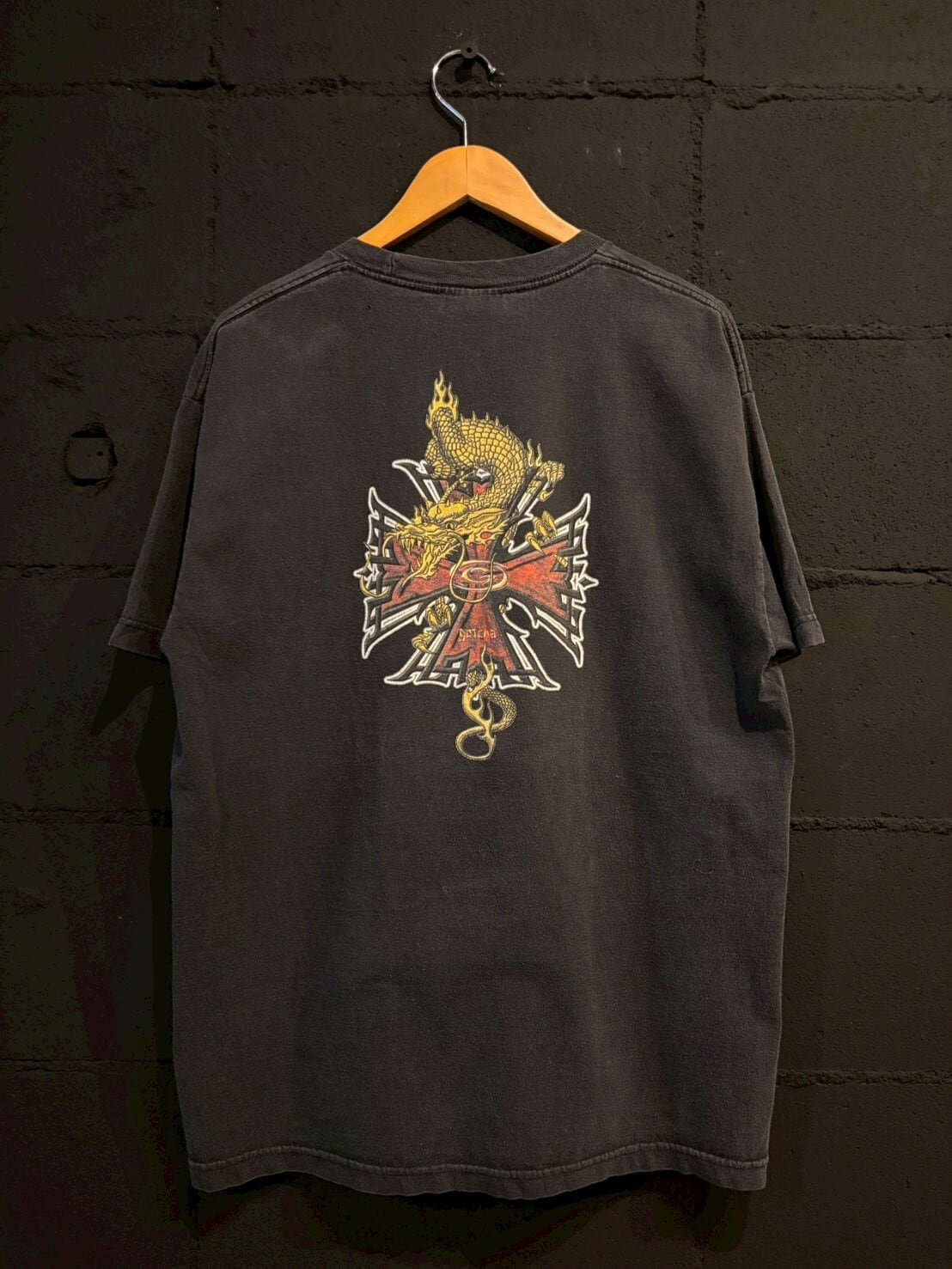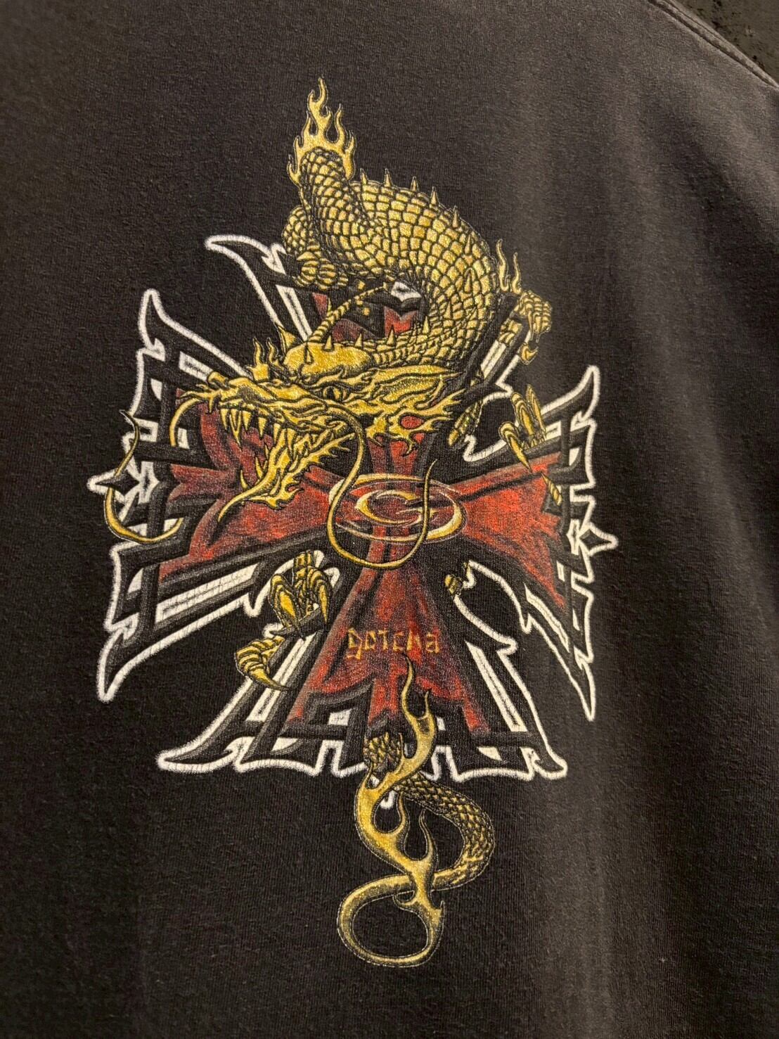 90s〜00s GOTCHA dragon &ironcross design print black faded Tshirt/90年代〜00年代 ガッチャ ドラゴン&アイアンクロス デザイン プリント 黒フェード tシャツ